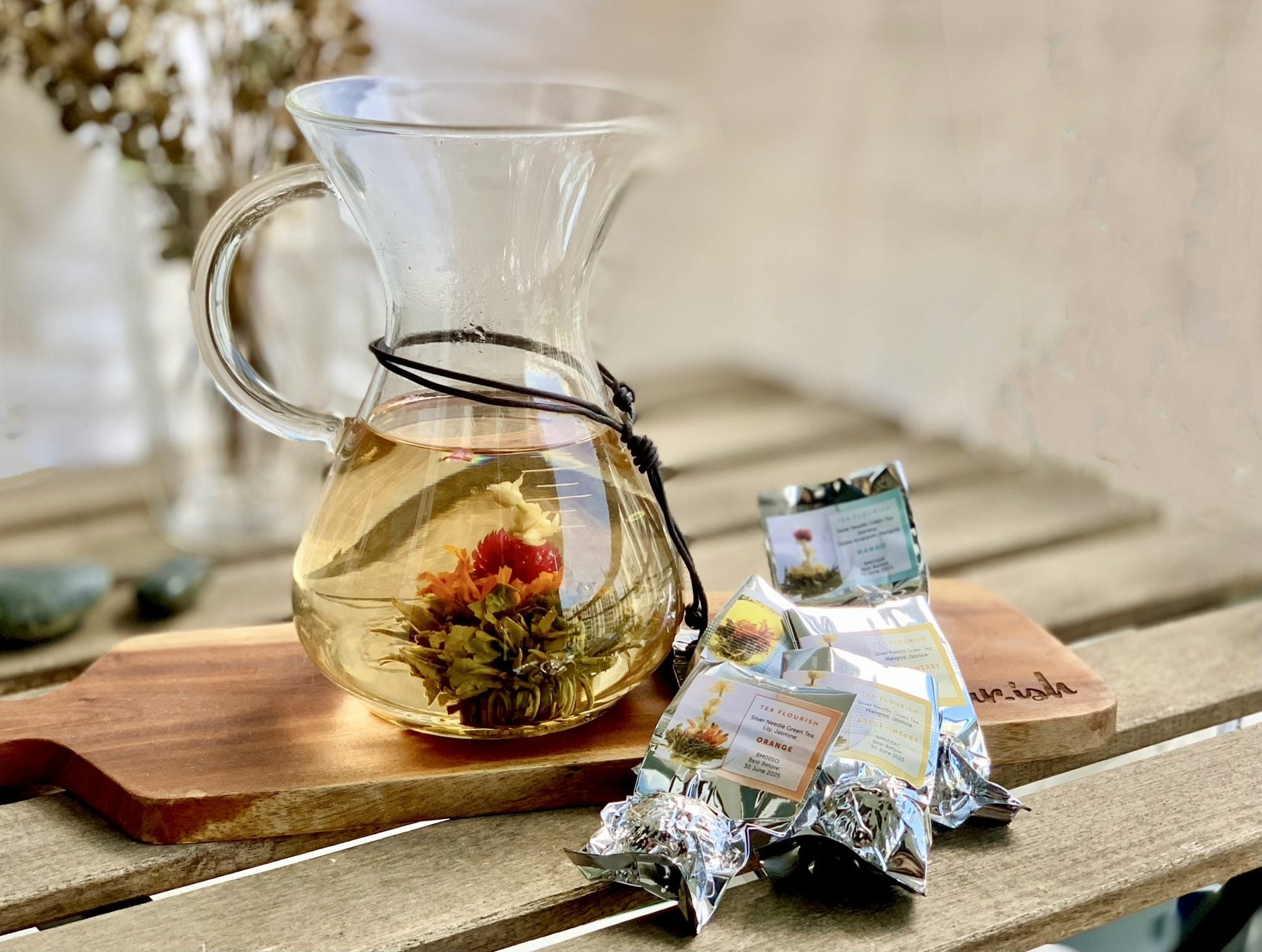 Made of high quality heat resistant Borosilicate glass. This tea/coffee carafe set can be used in both hot and cold beverage. It made a perfect gift with our Blooming teaballs!