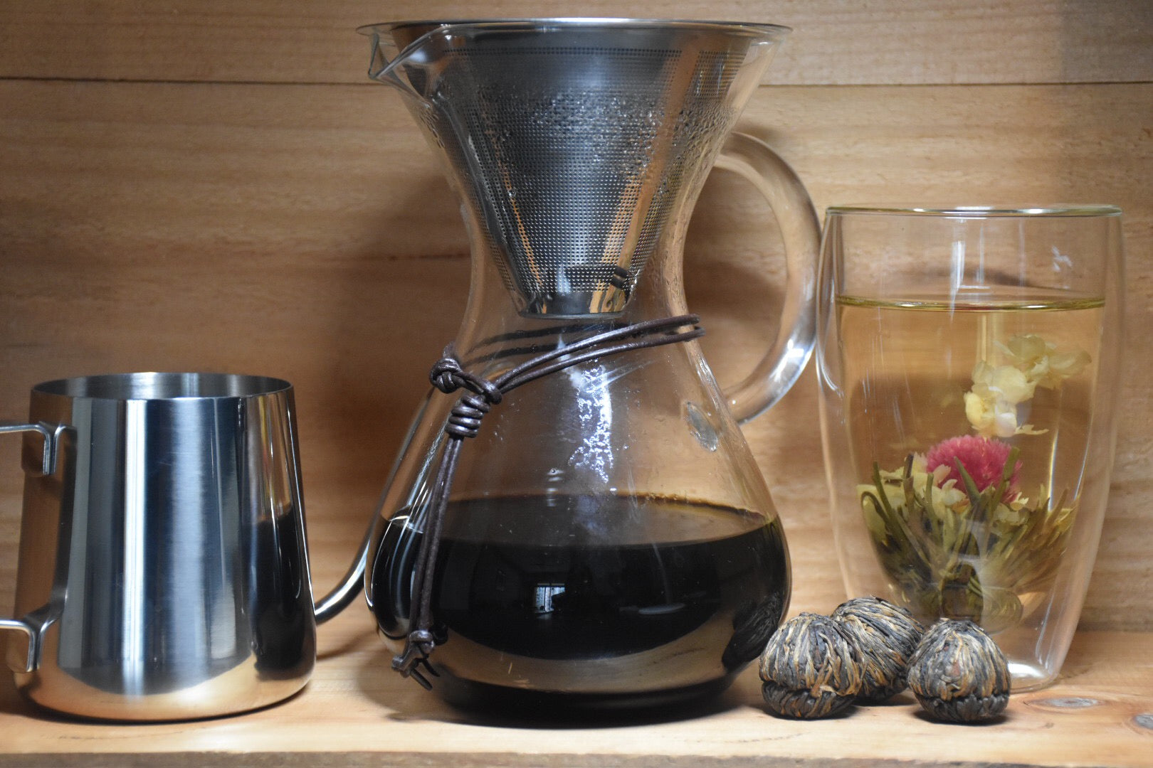 600ml - 750ml Coffee/Tea Carafe, Reusable Stainless Steel Mesh Filter and glass cover.
