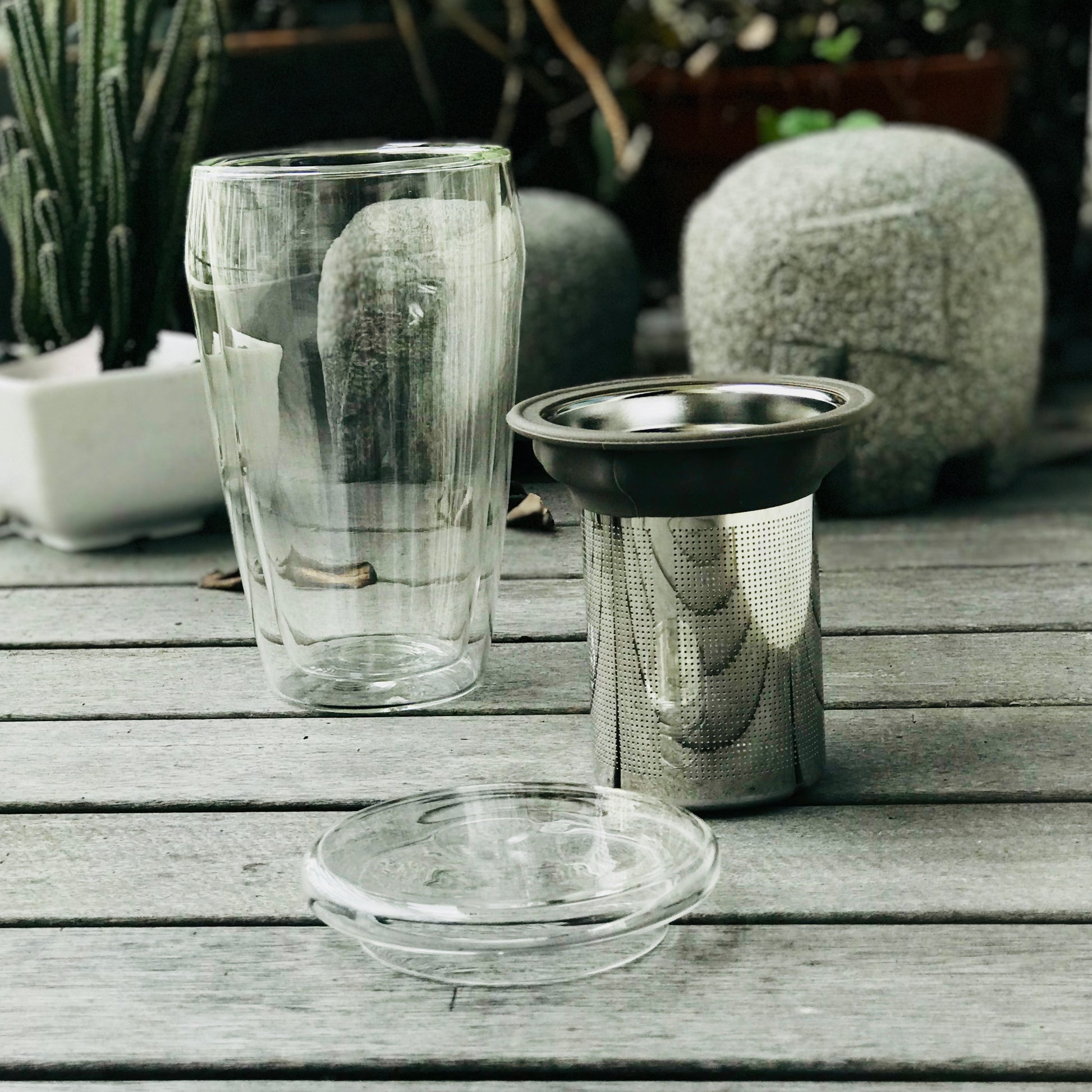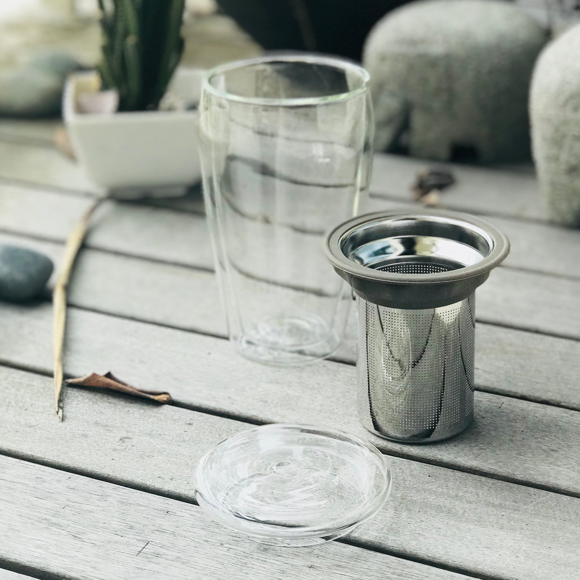 1 set of 450ml Double Wall Borosilicate Glass Insulated Tumblers with Lid and choice of Glass or Stainless Steel Tea Strainer.